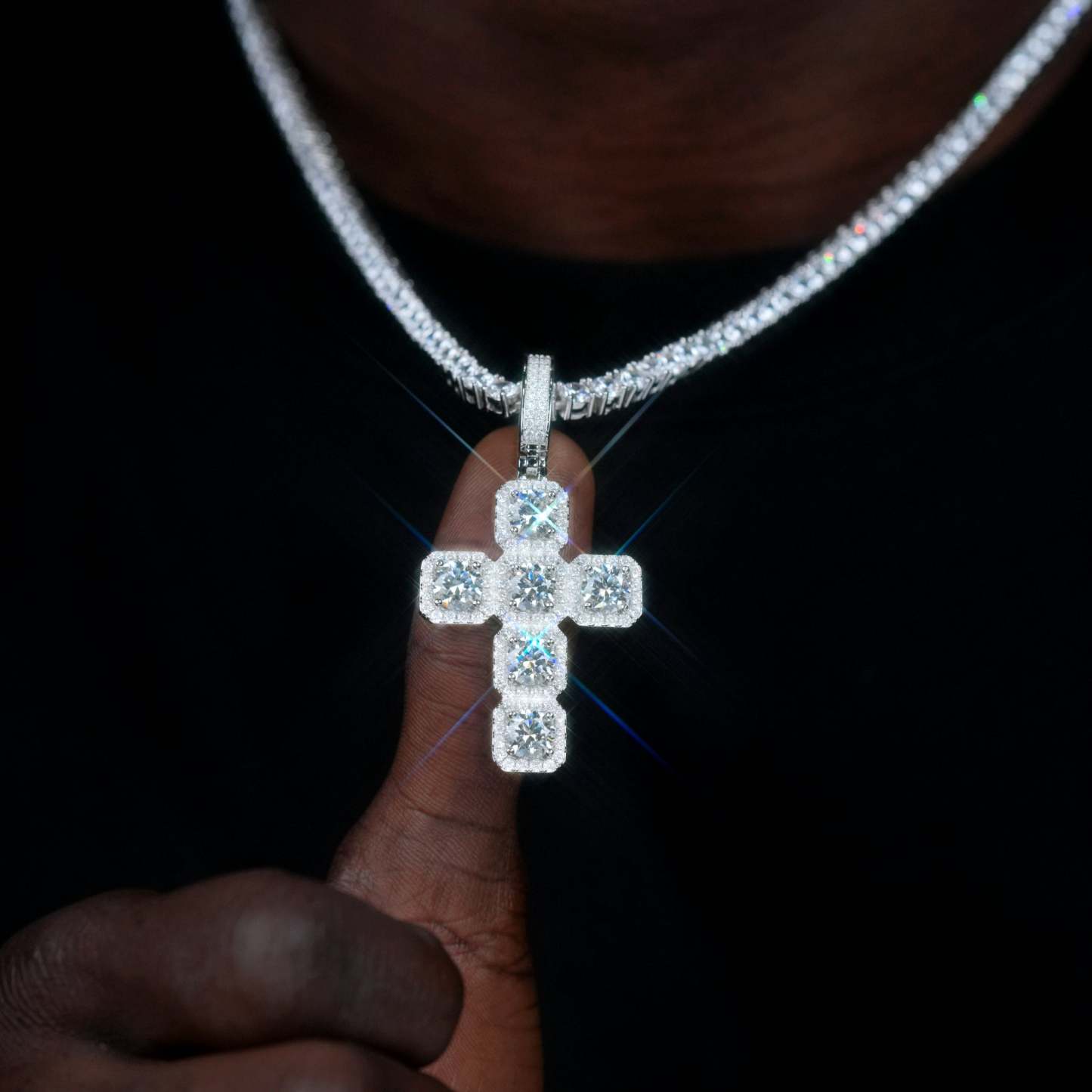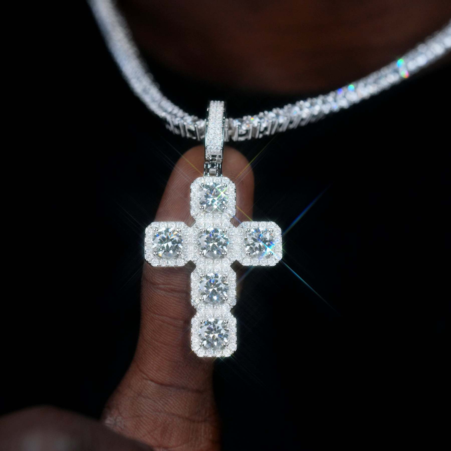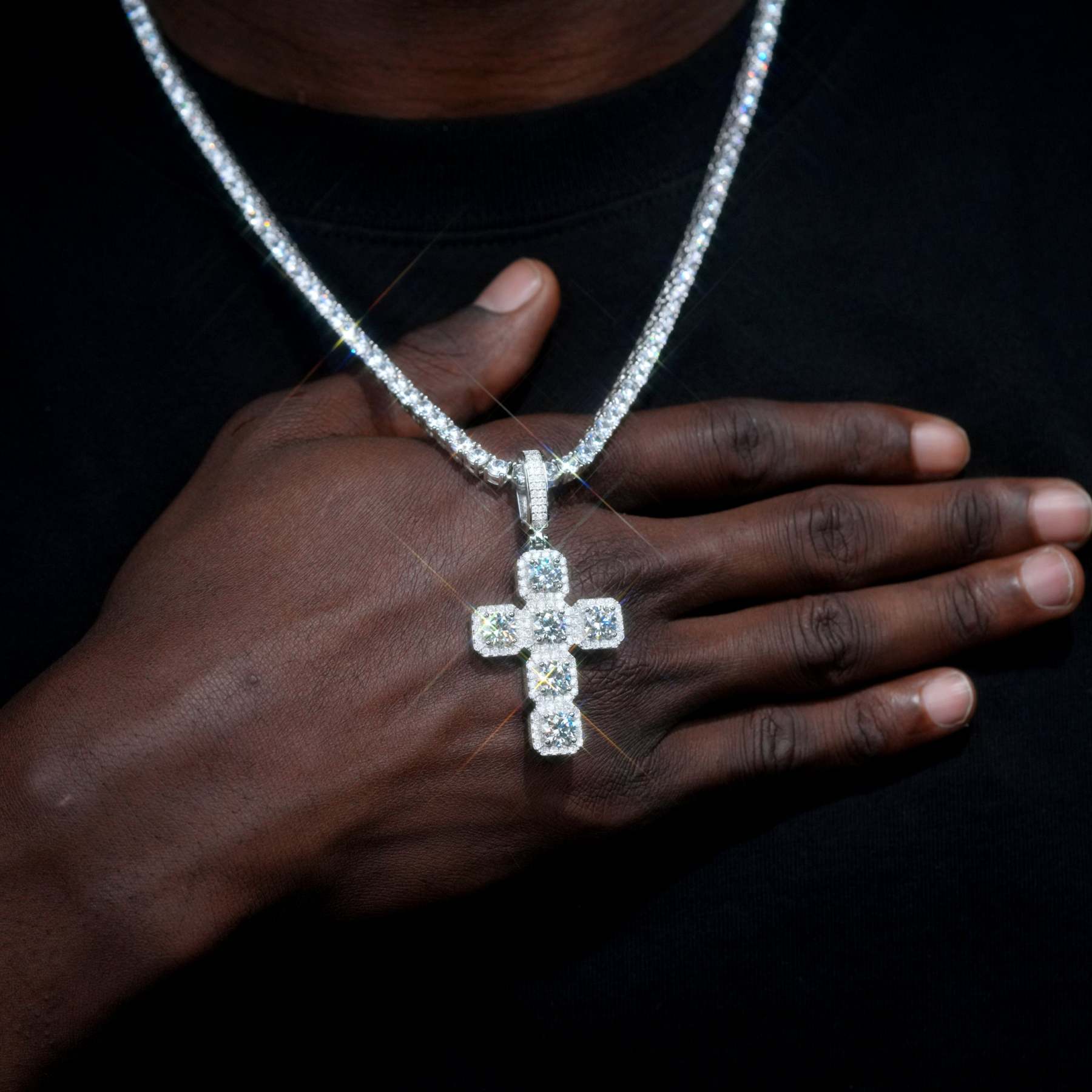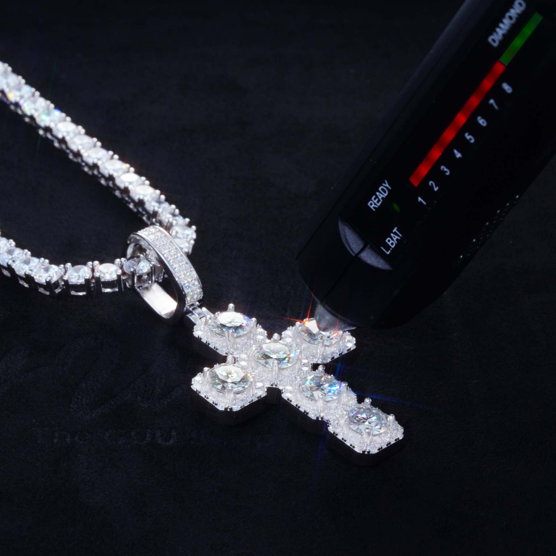 This top level hand crafted pendant is made solid 925 sterling silver. This masterpiece is covered with the highest grade Moissanite. Moissanite is proven to shine harder than CZ stones and known to pass commonly used diamond testers. Moissanite is made out of carbon and silicon while diamonds are fully carbon. They have a hardness rating of 9.25 out of 10 (diamonds are 10, CZ is 3-4). This means these stones will never lose shine or get dull like cheap fake stones. Get the exact look of a $15,000 high end piece for less!