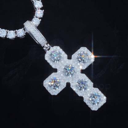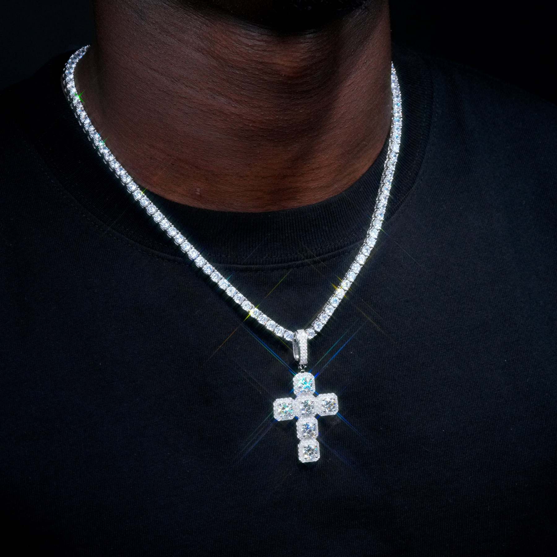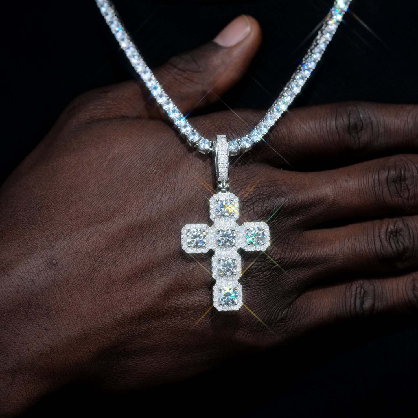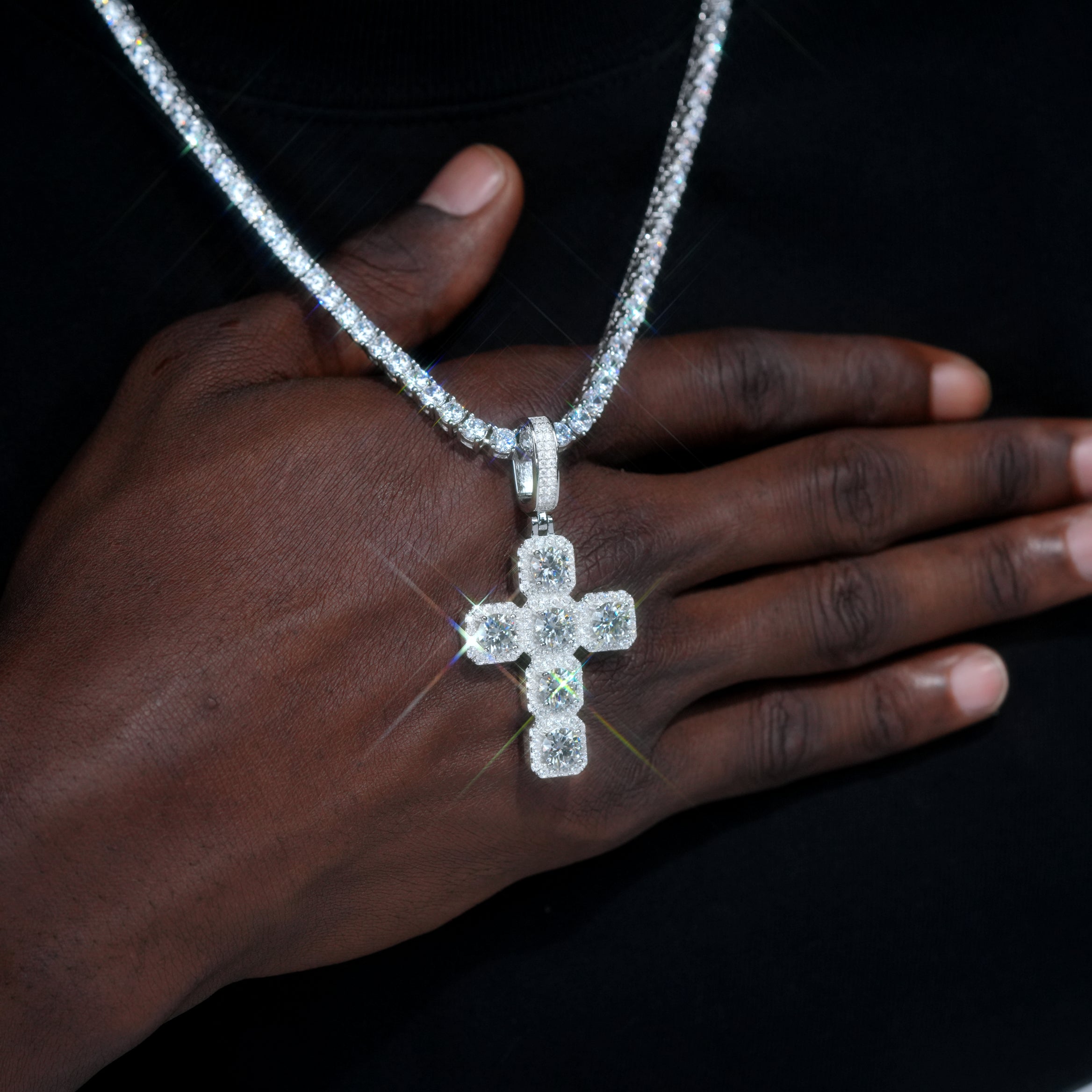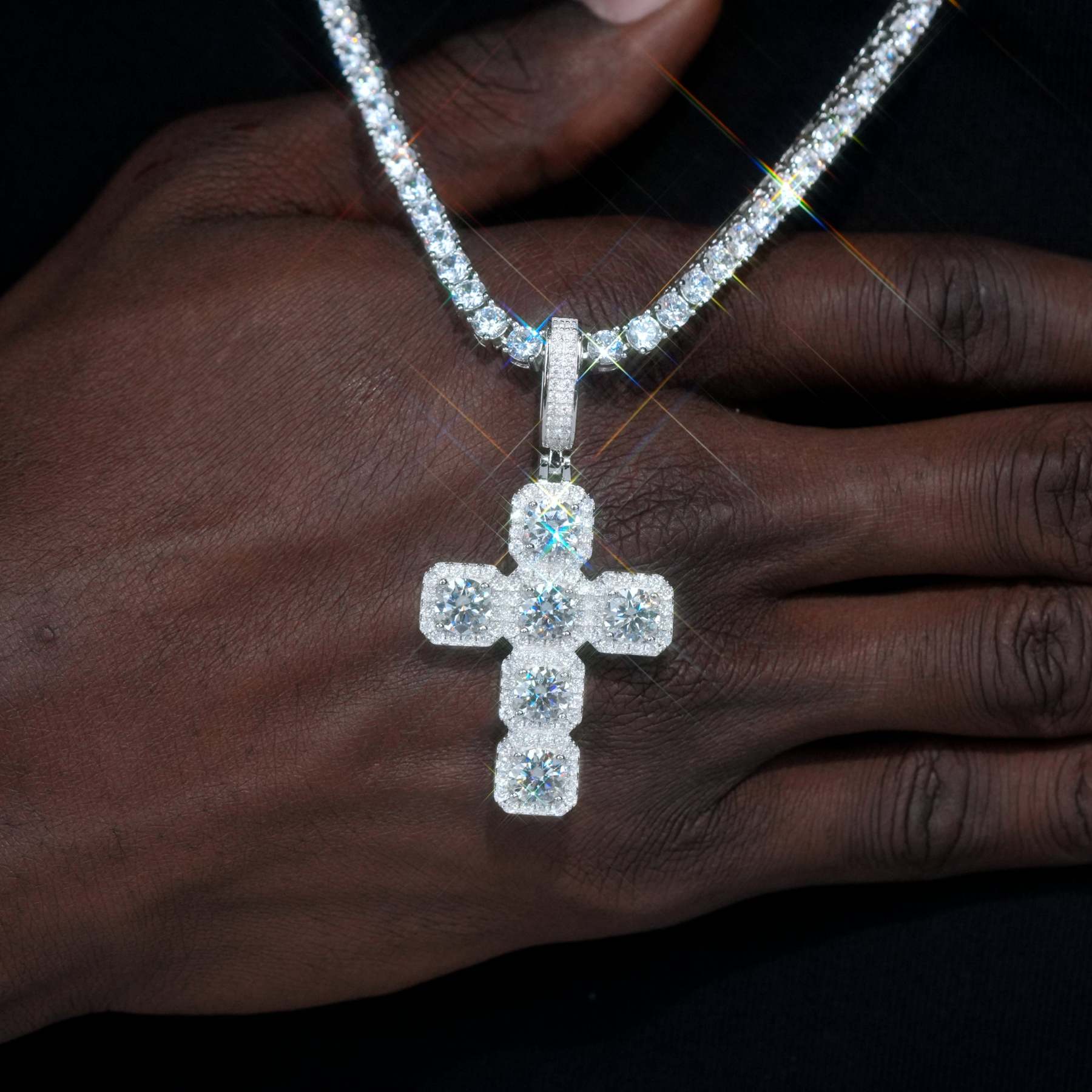This top level hand crafted pendant is made solid 925 sterling silver. This masterpiece is covered with the highest grade Moissanite. Moissanite is proven to shine harder than CZ stones and known to pass commonly used diamond testers. Moissanite is made out of carbon and silicon while diamonds are fully carbon. They have a hardness rating of 9.25 out of 10 (diamonds are 10, CZ is 3-4). This means these stones will never lose shine or get dull like cheap fake stones. Get the exact look of a $15,000 high end piece for less!