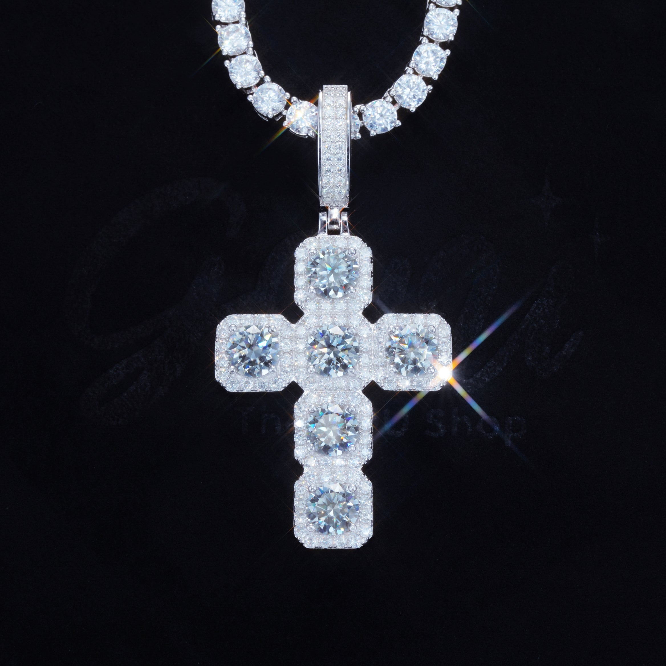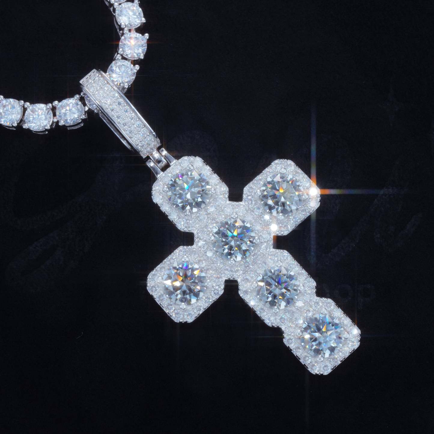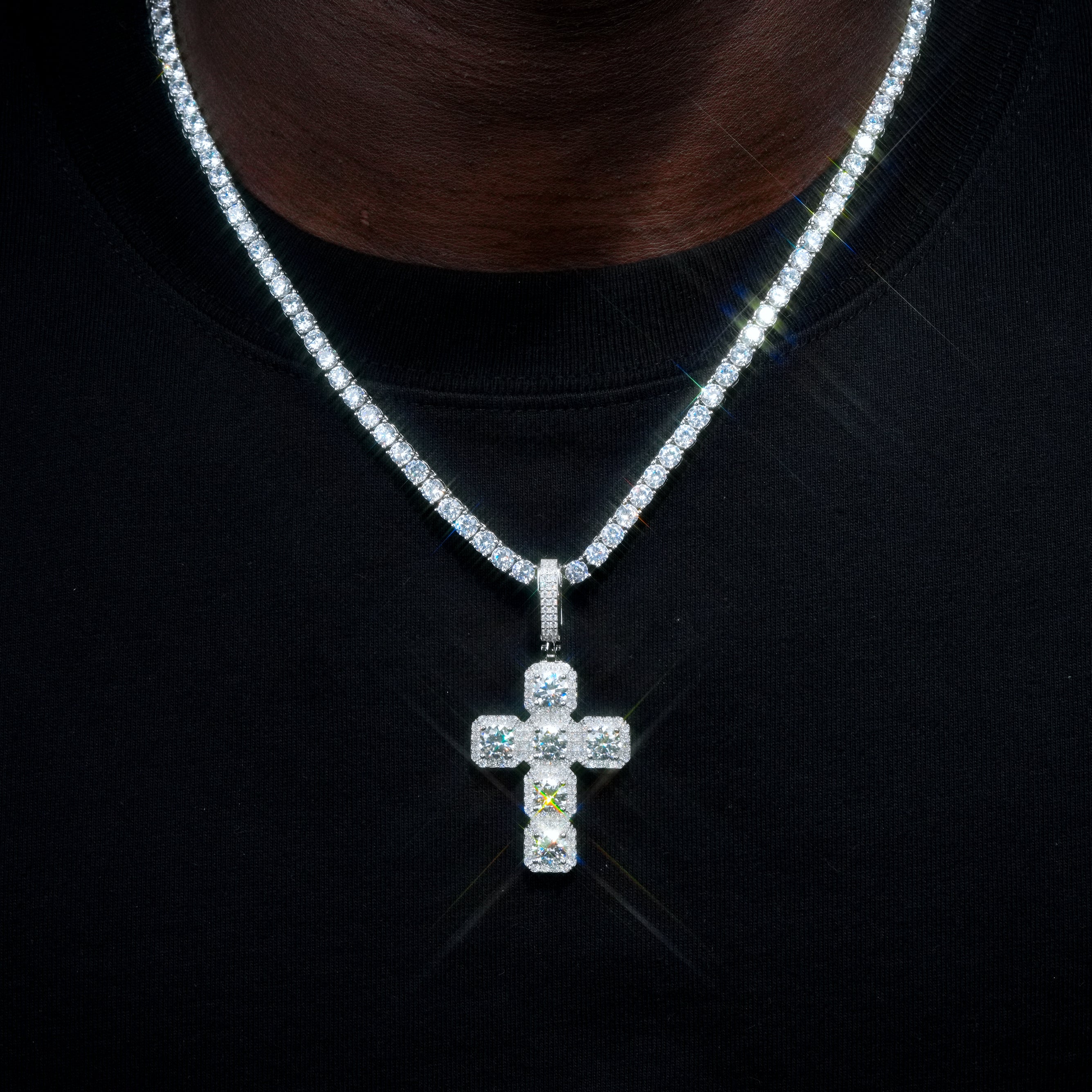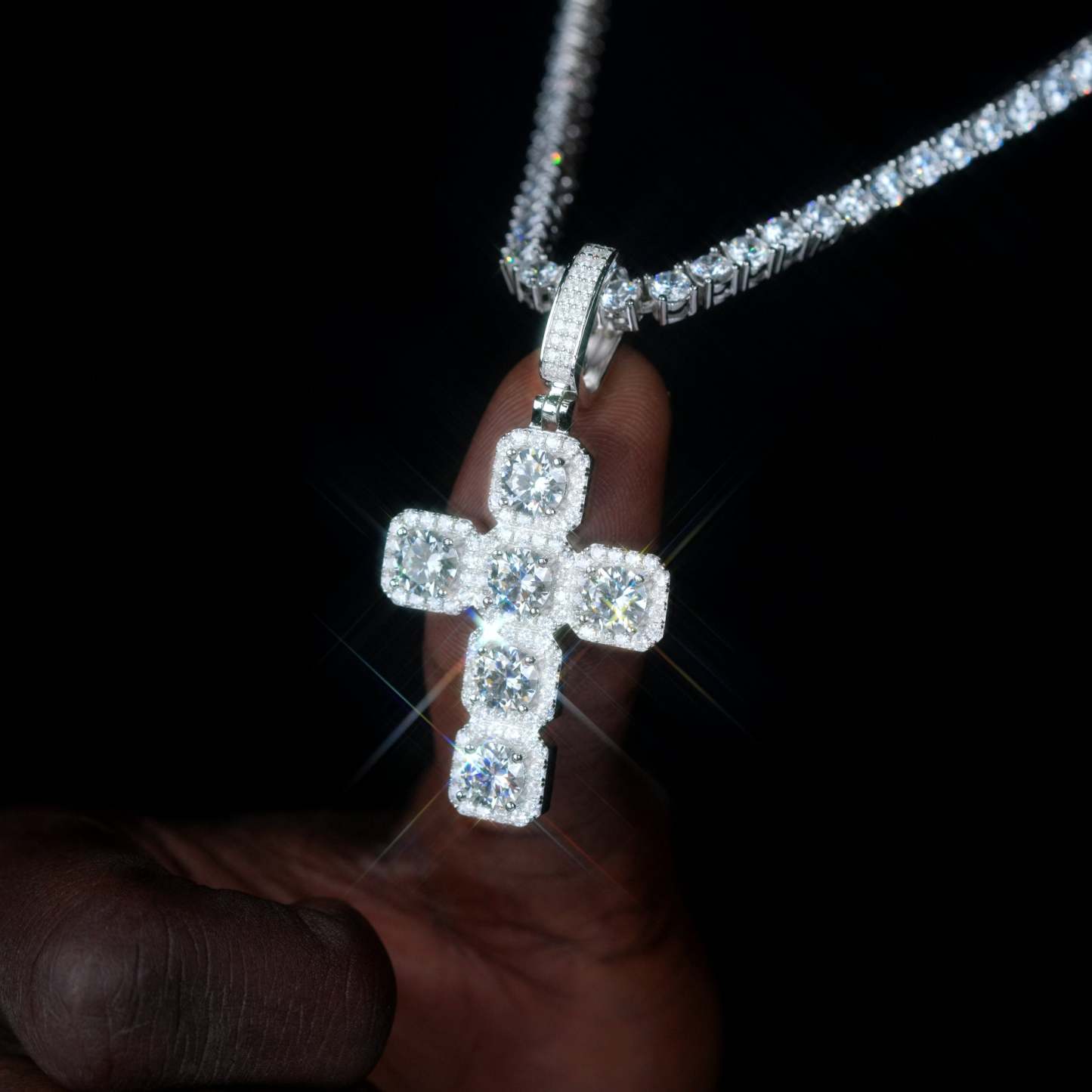 This top level hand crafted pendant is made solid 925 sterling silver. This masterpiece is covered with the highest grade Moissanite. Moissanite is proven to shine harder than CZ stones and known to pass commonly used diamond testers. Moissanite is made out of carbon and silicon while diamonds are fully carbon. They have a hardness rating of 9.25 out of 10 (diamonds are 10, CZ is 3-4). This means these stones will never lose shine or get dull like cheap fake stones. Get the exact look of a $15,000 high end piece for less!